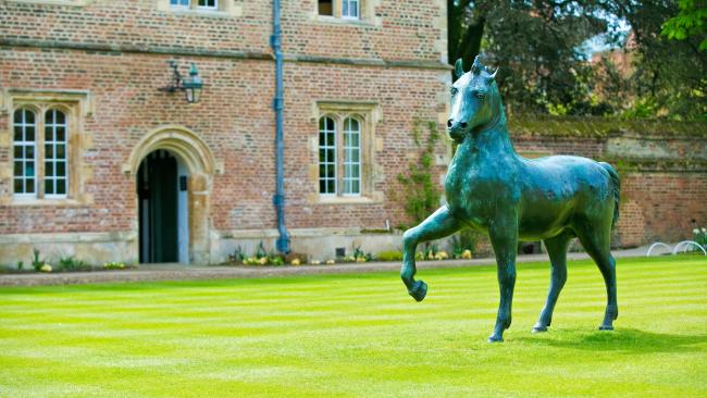 Jesus College is well known for its beautiful grounds. The College also has an impressive permanent collection, including works by John Bellany, Stephen Chambers, Barry Flanagan, John Gibbons, Antony Gormley, Albert Irvin, Richard Long, David Mach, Sarah Morris, Humphrey Ocean, Eduardo Paolozzi, Cornelia Parker, and Alison Wilding. First Court contains the famous Jesus Horse.